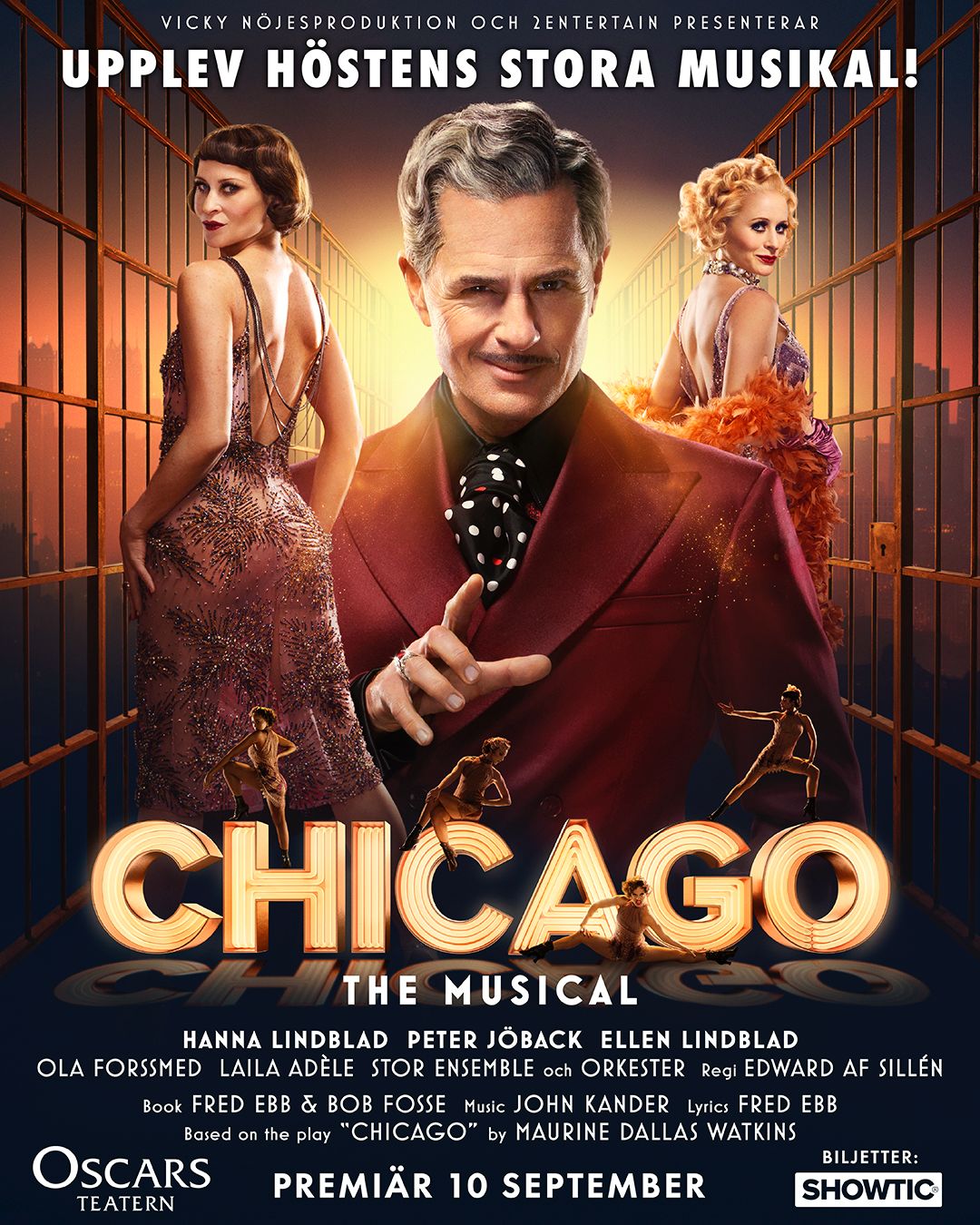 Den världsberömda musikalen Chicago intar Oscarsteatern i höst i en storslagen, påkostad, svensk uppsättning. I regi av Edward af Sillén och med världsstjärnan Peter Jöback och systrarna Hanna och Ellen Lindblad i huvudrollerna bjuds publiken på en glittrande musikalupplevelse fylld av jazz, 1920-talsglamour och spektakulära shownummer. Chicago är en prisbelönt Broadway-klassiker där mord, berömmelse och showbusiness möts i en sylvass och underhållande satir. Handlingen utspelar sig i 1920-talets Chicago och kretsar kring Roxie Hart (Ellen Lindblad), en kvinna med stora drömmar om rampljuset. När ett triangeldrama slutar i mord hamnar hon i stadens ökända kvinnofängelse, där hon möter vaudeville-stjärnan Velma Kelly (Hanna Lindblad) – lika ambitiös som farlig. Snart förvandlas deras öde till en medial cirkus där popularitet och rubriker betyder allt. Med hjälp av den karismatiske advokaten Billy Flynn (Peter Jöback) blir rättssalen en scen och sanningen ett verktyg som kan formas efter behov. Runt dem rör sig färgstarka karaktärer som den bortglömde maken Amos (Ola Forssmed) och den maktfullkomliga Mama Morton (Laila Adéle).