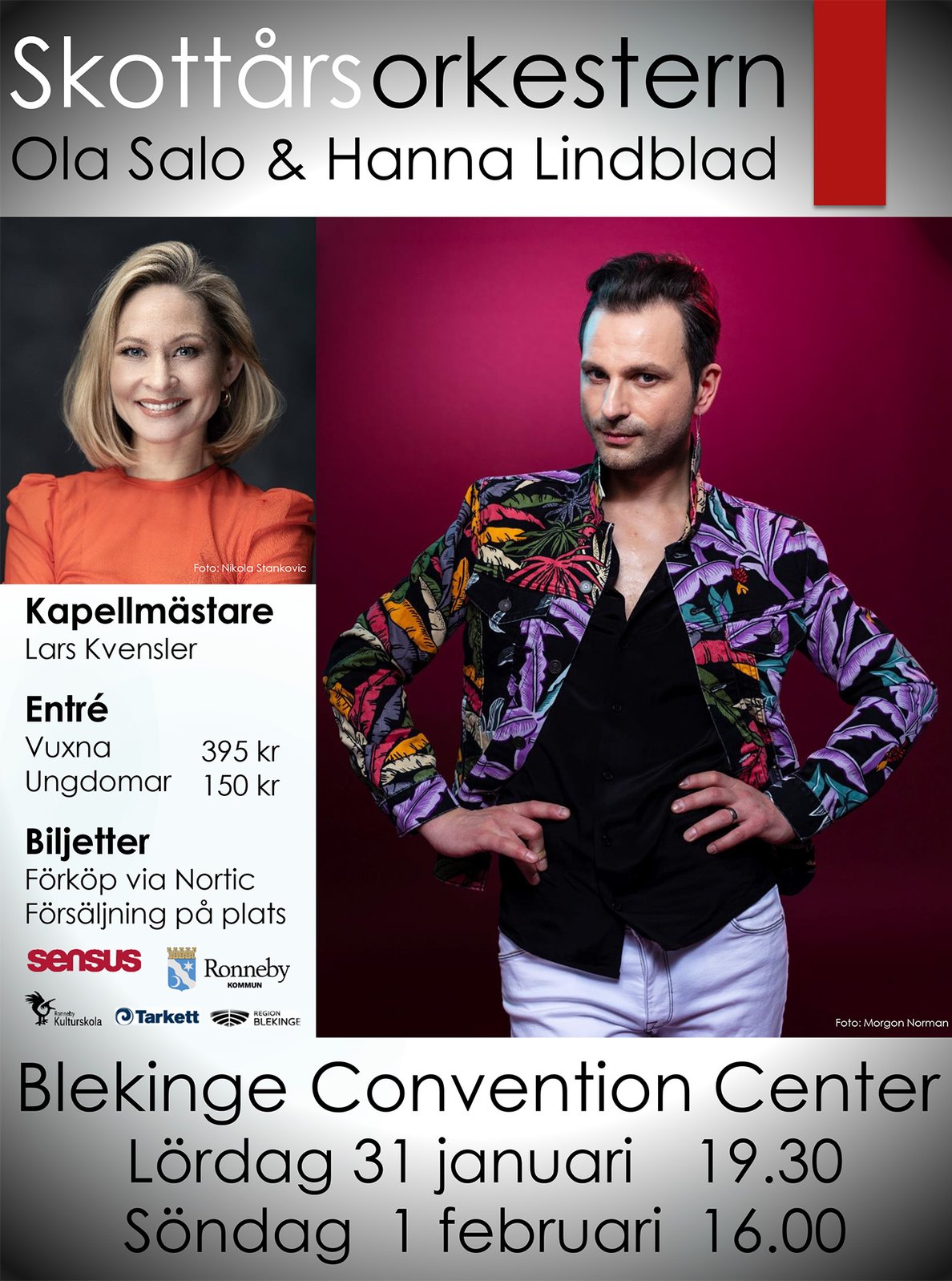 Varmt välkomna till Blekinge Convention Center i Ronneby. Stjärnartisterna Ola Salo och Hanna Lindblad möter Skottårsorkestern i ett varierat program som går över flera olika genrer med rock och pop, musikal mm.